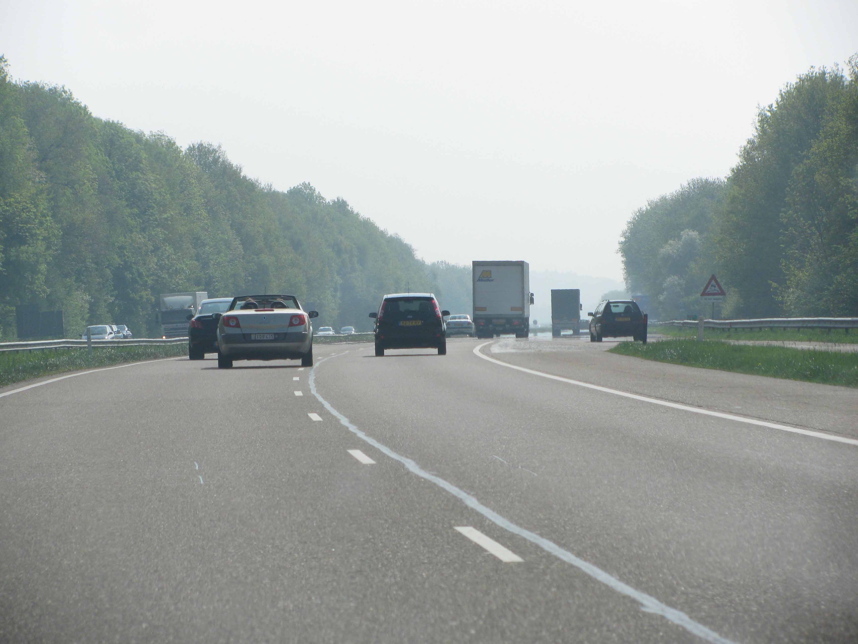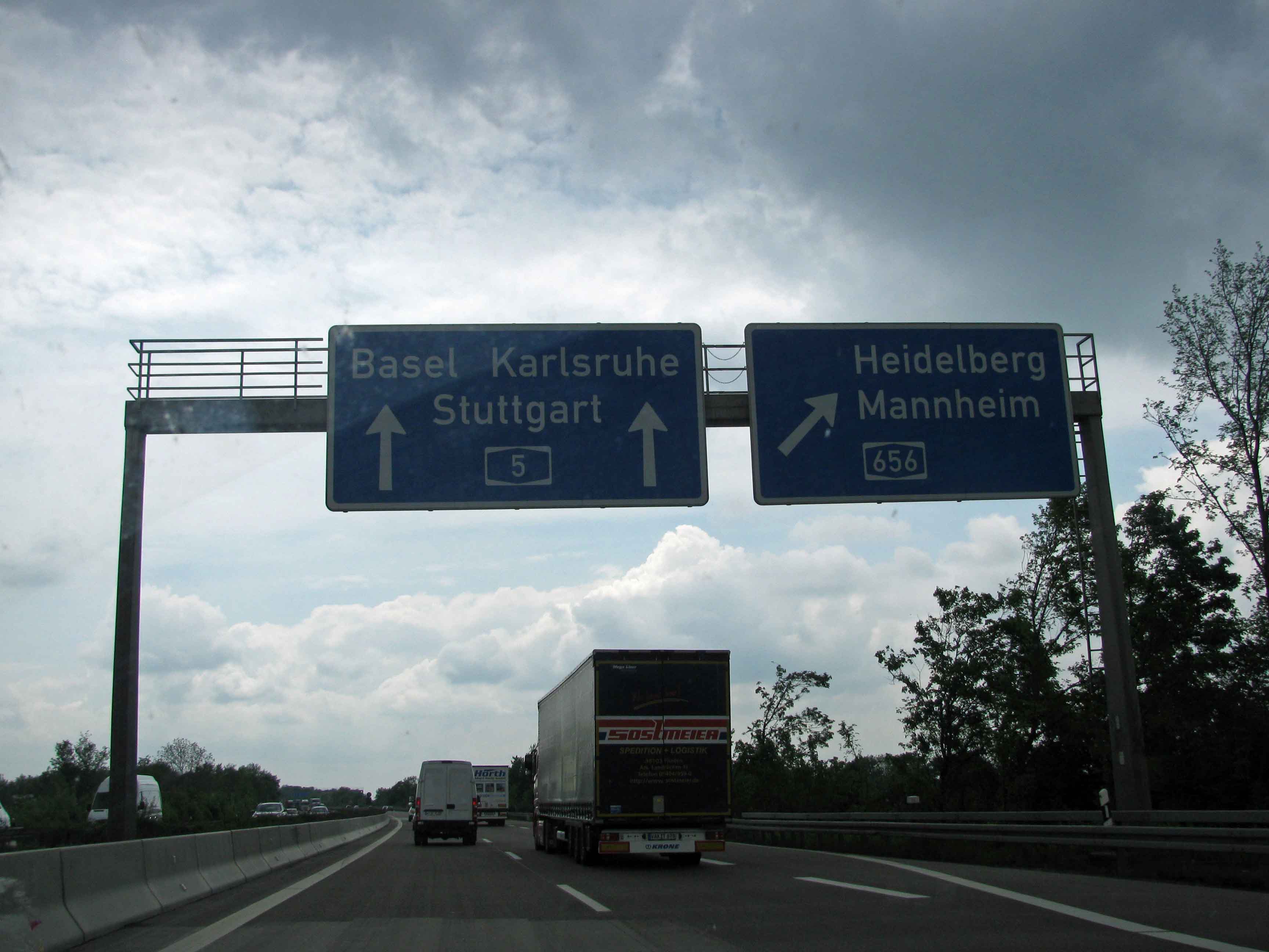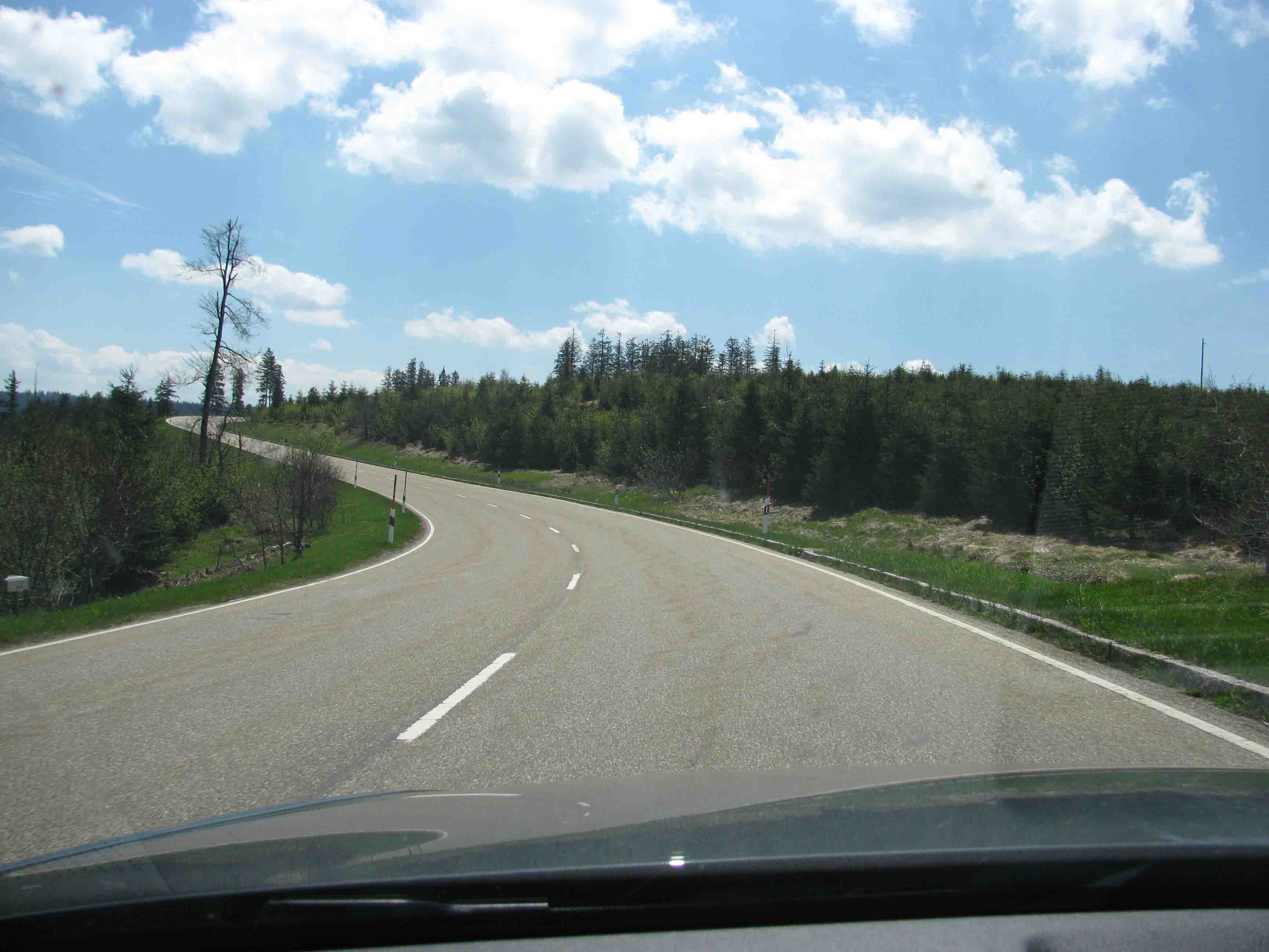 ..though it’s not long before it’s mucky again. Once over Westerwald (and its equally low lying neighbouring range Taunus) – and past Frankfurt – the weather improves considerably. We’re allowed on the famous A5, now the 480 mile HaFraBa, from Hamburg in the north via Frankfurt to Basel just over the Swiss border. After Karlsruhe it closely traces the French border past Strasbourg.