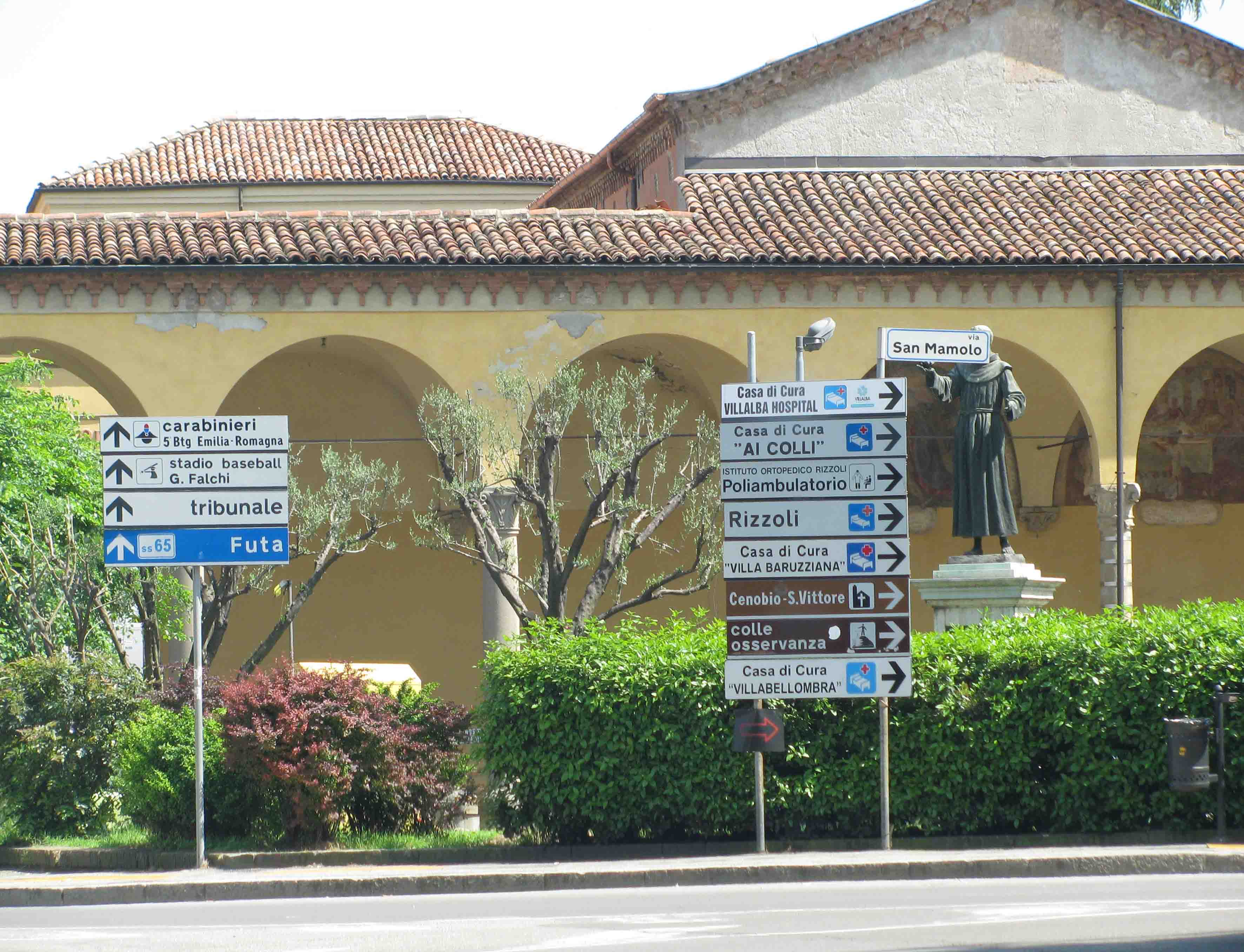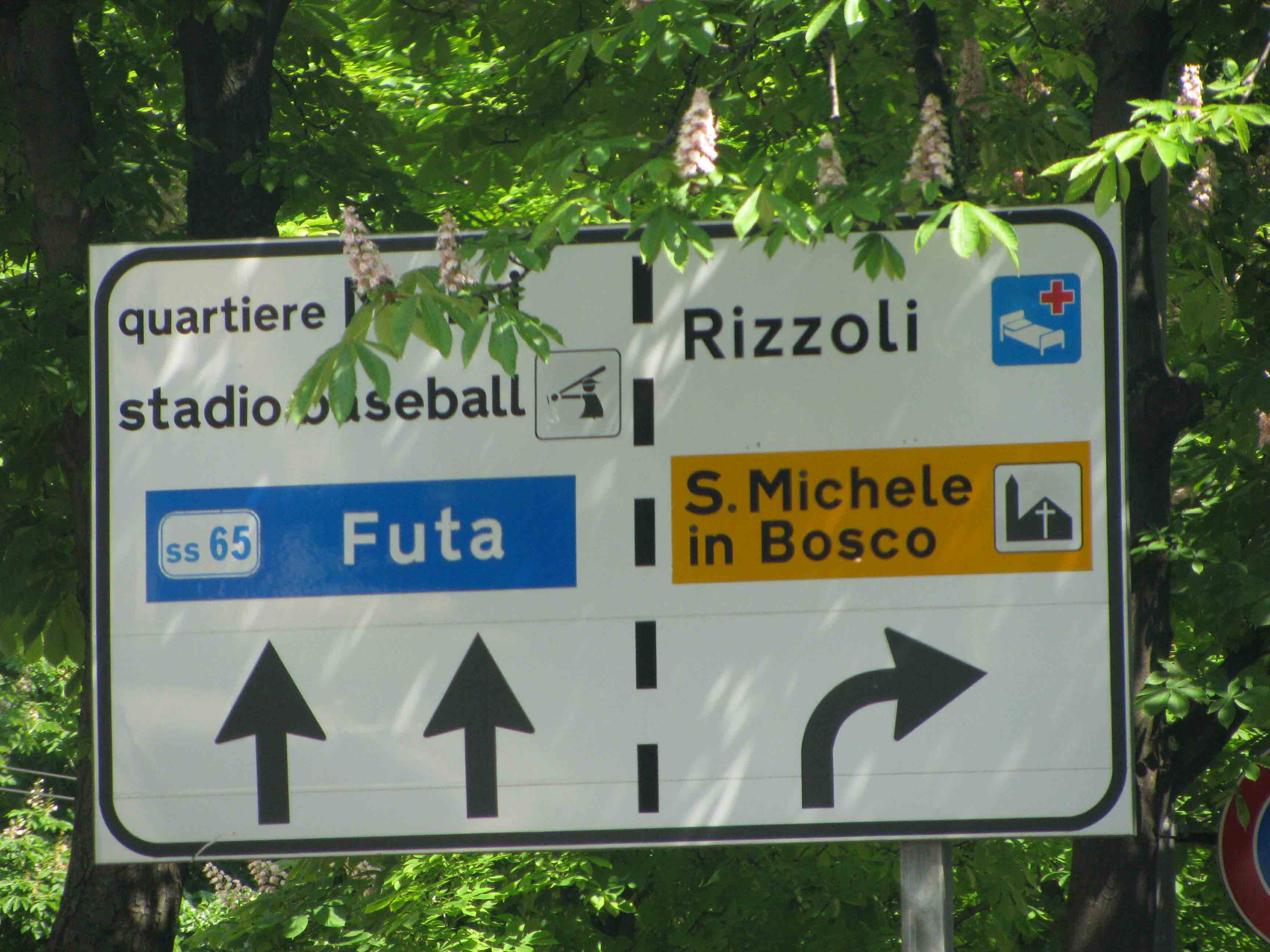 14:30 Bologna. Including a fuel stop, border queue (and supermarket shop) we’re only a bit behind schedule. No driving through the epicentre of Bologna since they have an LTZ limited traffic zone (official link) and the police can track you down in the UK. Anybody can use the ring road round the old town though. Via San Mamolo (top right) heads due south. There’s one more junction before the SS65 Futa road (bottom left).
