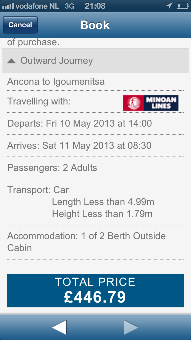 Maybe aferry.co.uk’s app is too easy considering that in five or six clicks we spent £446.79, the price for one car and two adults in an outside cabin on Minoan Lines three days in advance. That’s one way BTW.
