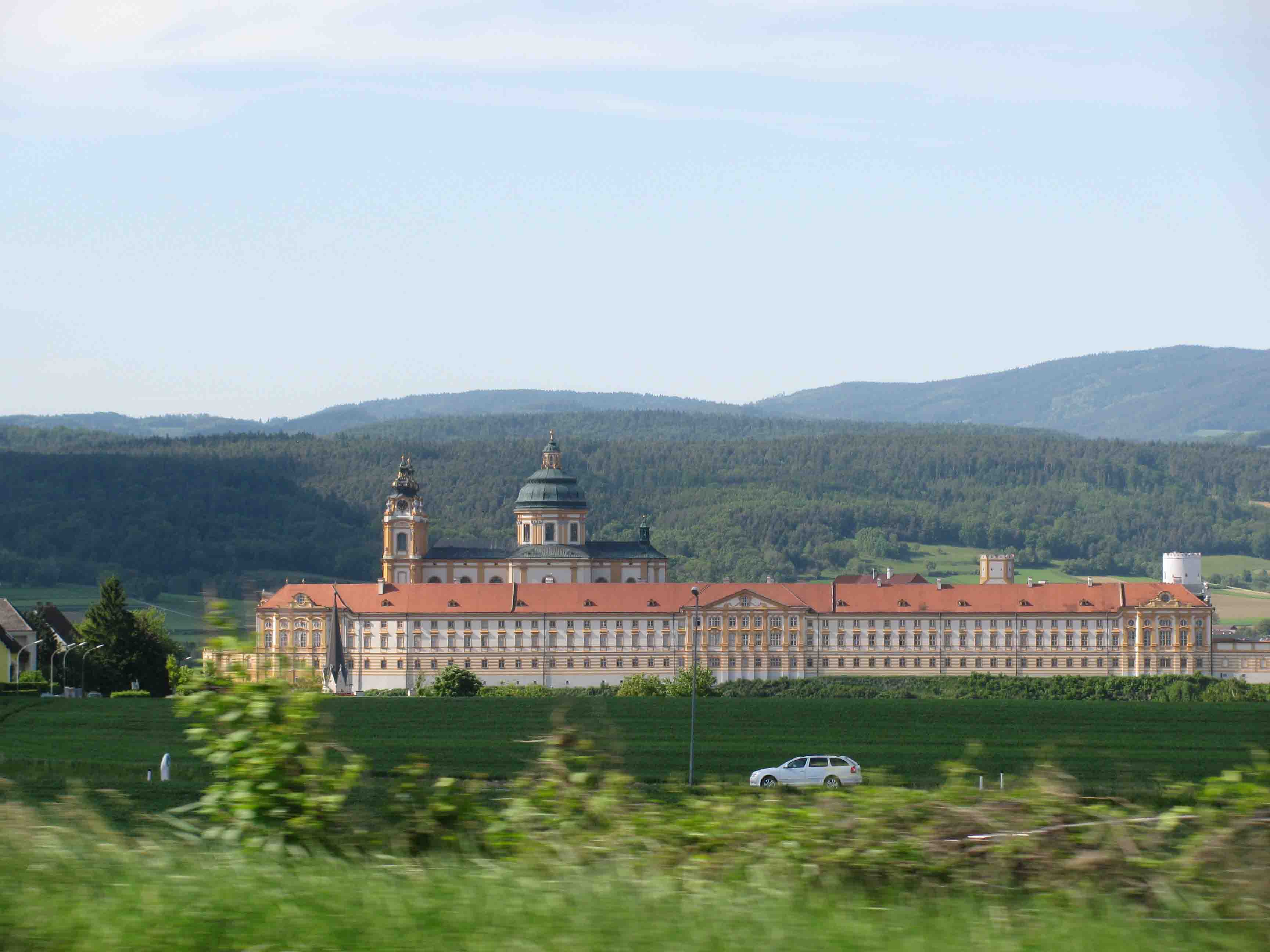 Melk Abbey as seen from the A1 West Autobahn in Austria, halfway between Vienna and Salzburg. Built in the early 18th century, with five internal courtyards, the Benedictine monastery overlooks the Danube on the other side. Definitely worth a look next time.