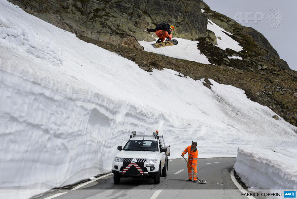 The official news agency Agence France-Presse (@AFP) tweeted this photo today of a snowboarder jumping across a mountain pass connecting Switzerland and Italy as a worker clears snow. Taken June 12 (yesterday).