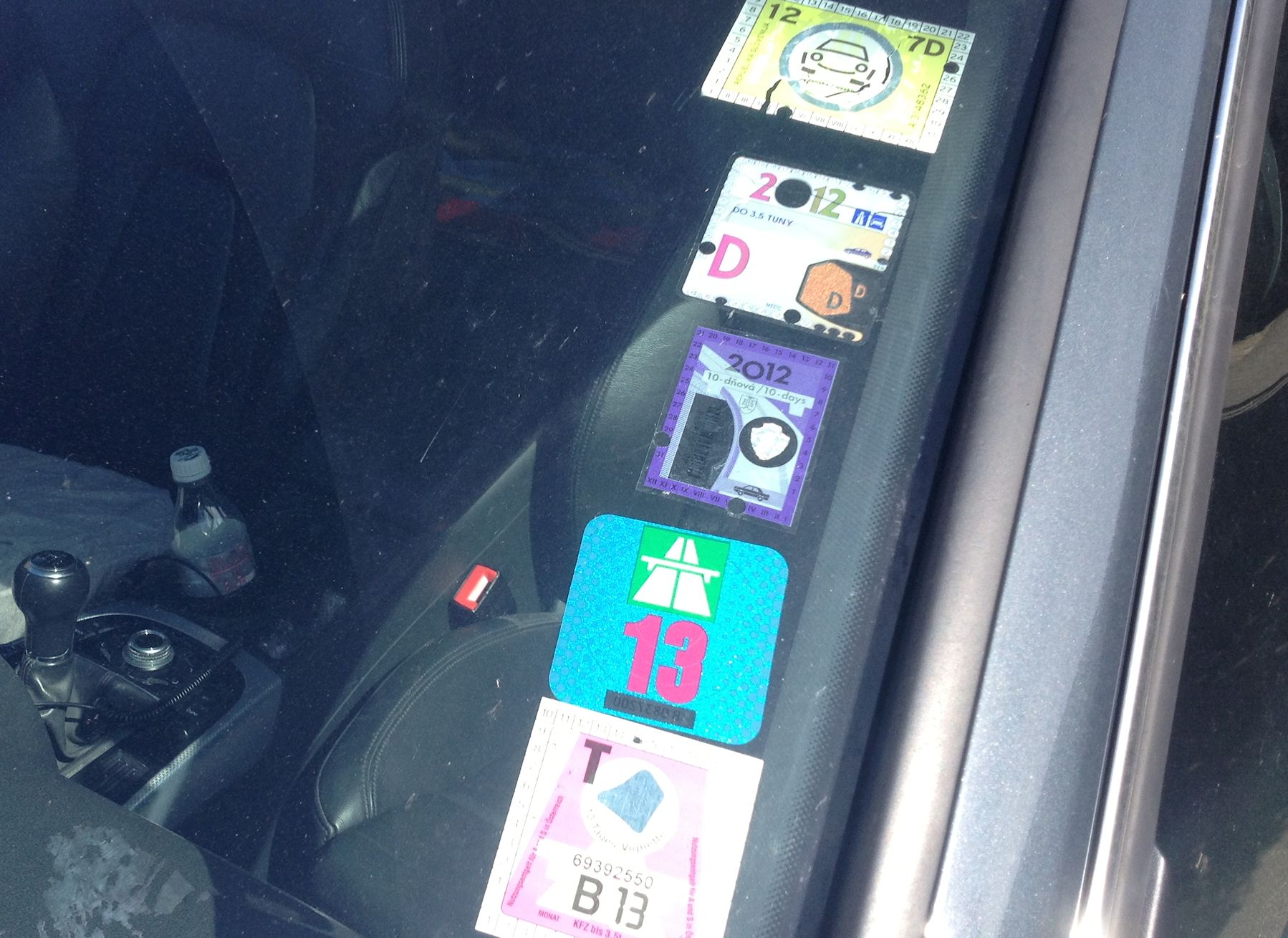 Vignette stickers crowding the windscreen are the bane of every transcontinental driver’s life. It’s quite cool though that all the neighbours can see where you’ve been on holiday and unavoidable because they are deliberately hard to get off (and impossible to re-stick).