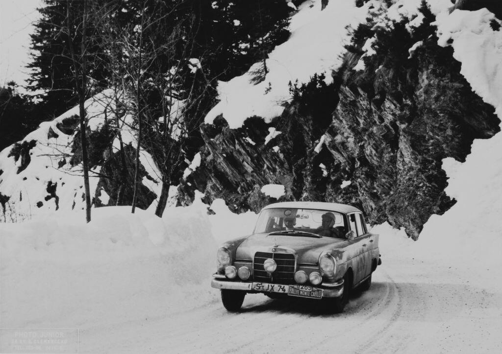 Baroness Ewy Rosqvist and Ursula Worth winning the Ladies’ Cup at the 1963 Monte Carlo Rally in a Mercedes Benz 220SE. This was when the event really was a Rally. Competitors started from one of seven cities – Stockholm, Paris, Glasgow, Lisbon, Frankfurt, Warsaw, Athens – and ‘rallied’ in Monte Carlo. History records there were 341 entries that year, 296 starters and 102 finishers. Rosqvist and Worth came 16th overall. Thirteen crews started from Athens but they were unable to reach Belgrade because of snow. Another Mercedes driver, H.Felder, stopped to help Rosemary Smith and Rosemary Seers who had rolled their Sunbeam Rapier into a ditch “while not wearing seatbelts” but lost so much time he retired too. Patricia Ozanne crashed her Mini Cooper into a lorry on the M1.