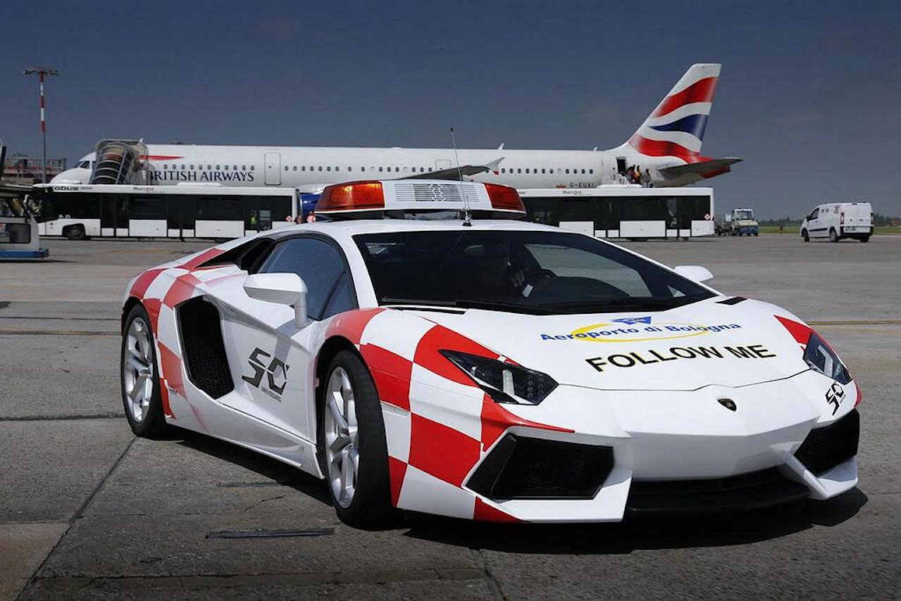 Follow me: you just would wouldn’t you? Back by popular demand. What started out as a publicity stunt over the summer to promote the 50th anniversary of local firm Lamborghini is now a permanent feature. Bologna Airport’s specially liveried 700bhp Aventador LP-700 is actually used to accompany planes to and from the taxiway aprons, up to 140 times each day. Passengers can also buy mini Follow Mes in the airport shop. There’s also a display of full-size treasures from the Lamborghini Museum in the entrance hall.