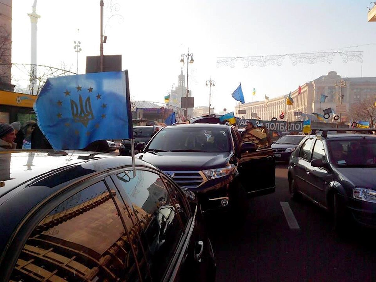Automaiden Ukraine: pro-Europe ‘Maiden’ protestors assemble in central Kiev yesterday morning before driving out to picket President Yanukovych’s lavish country house. Pic via @Ukroblogger
