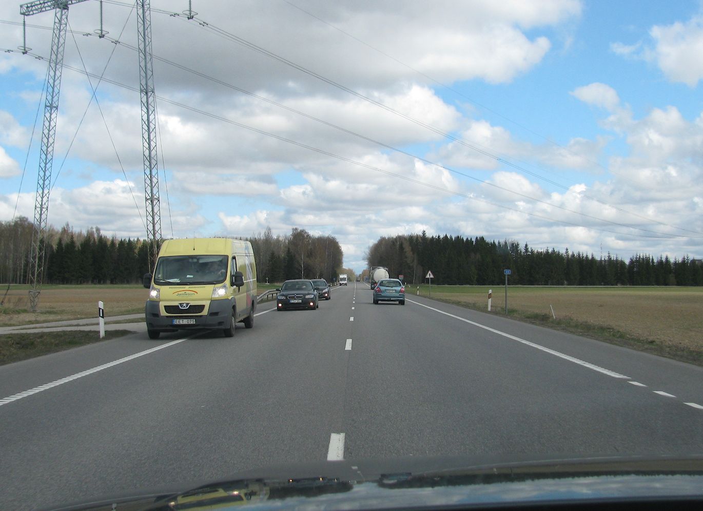 North of Riga, Via Baltica runs right along the coast. At various times we can see the sea through a thin border of trees. At one point we stop for a wee and hear the waves lapping. Time is marginal but doable, we just need to keep it above 100kph. Towns and villages are very sparse on this last stretch which helps a lot.