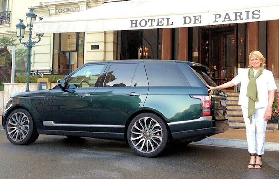 Ageing American ‘Taste Queen’ Martha Stewart shows she hasn’t lost her touch as she poses beside an Aintree Green Range Rover outside the Hotel de Paris in Monaco. Land Rover provided the VIP transport during last week’s Entrepreneur of the Year Awards of which Stewart was a judge.
