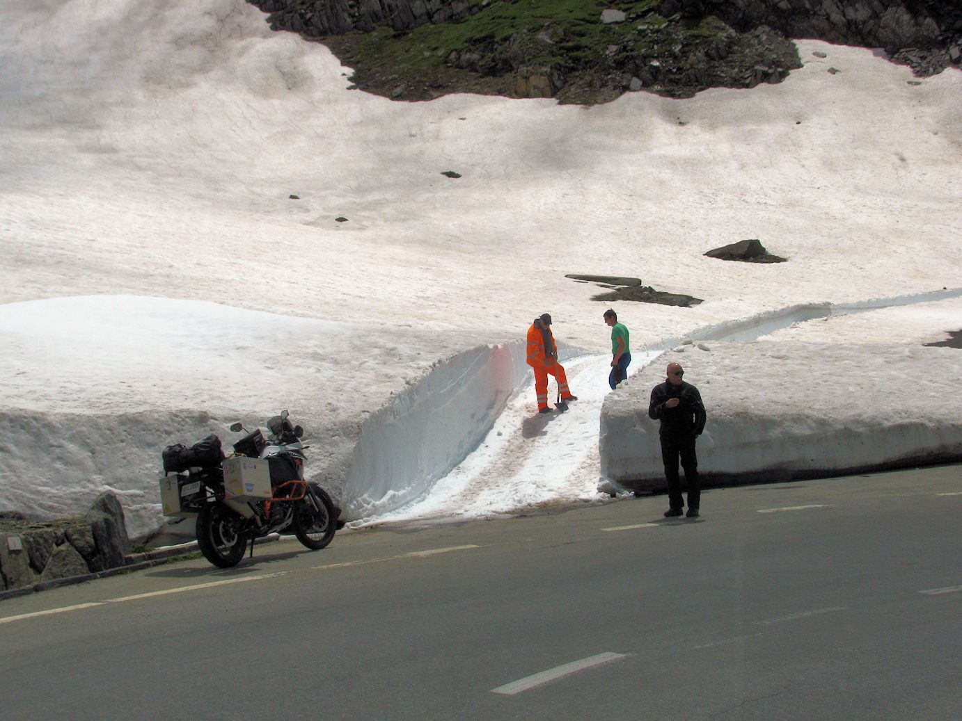 These chaps are starting to clear snow from the off-shoot road to Griesee, a lake fed directly by the 5km long Gries Glacier. The southern edge of the lake is around 100m from the Italian border. Due to the height, Nufenen is one of the last Swiss mountain roads to open for the summer, normally by mid-June.