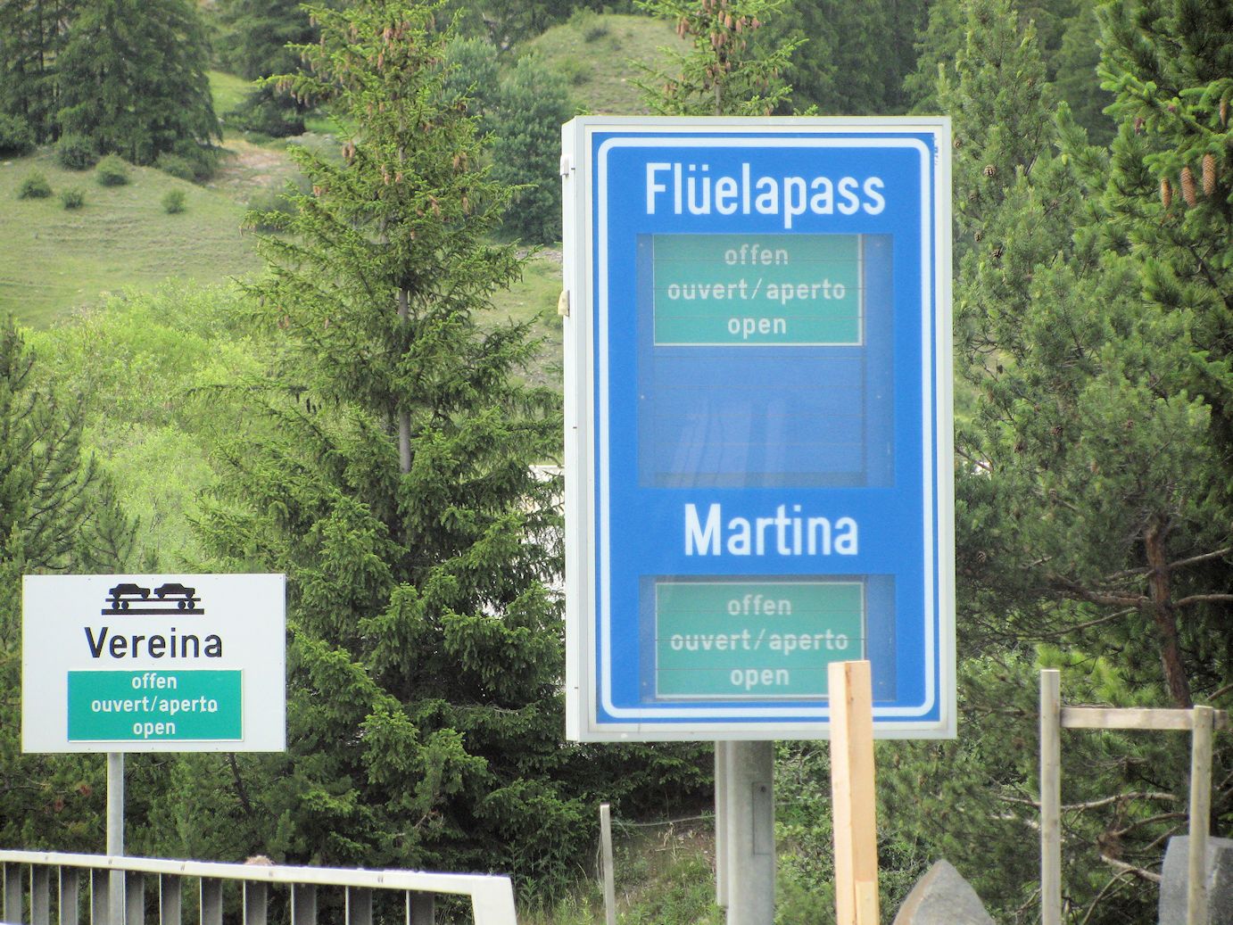 Stelvio to St Moritz: Fluelapass, marked in green. Also see Ofenpass and Albulapass.