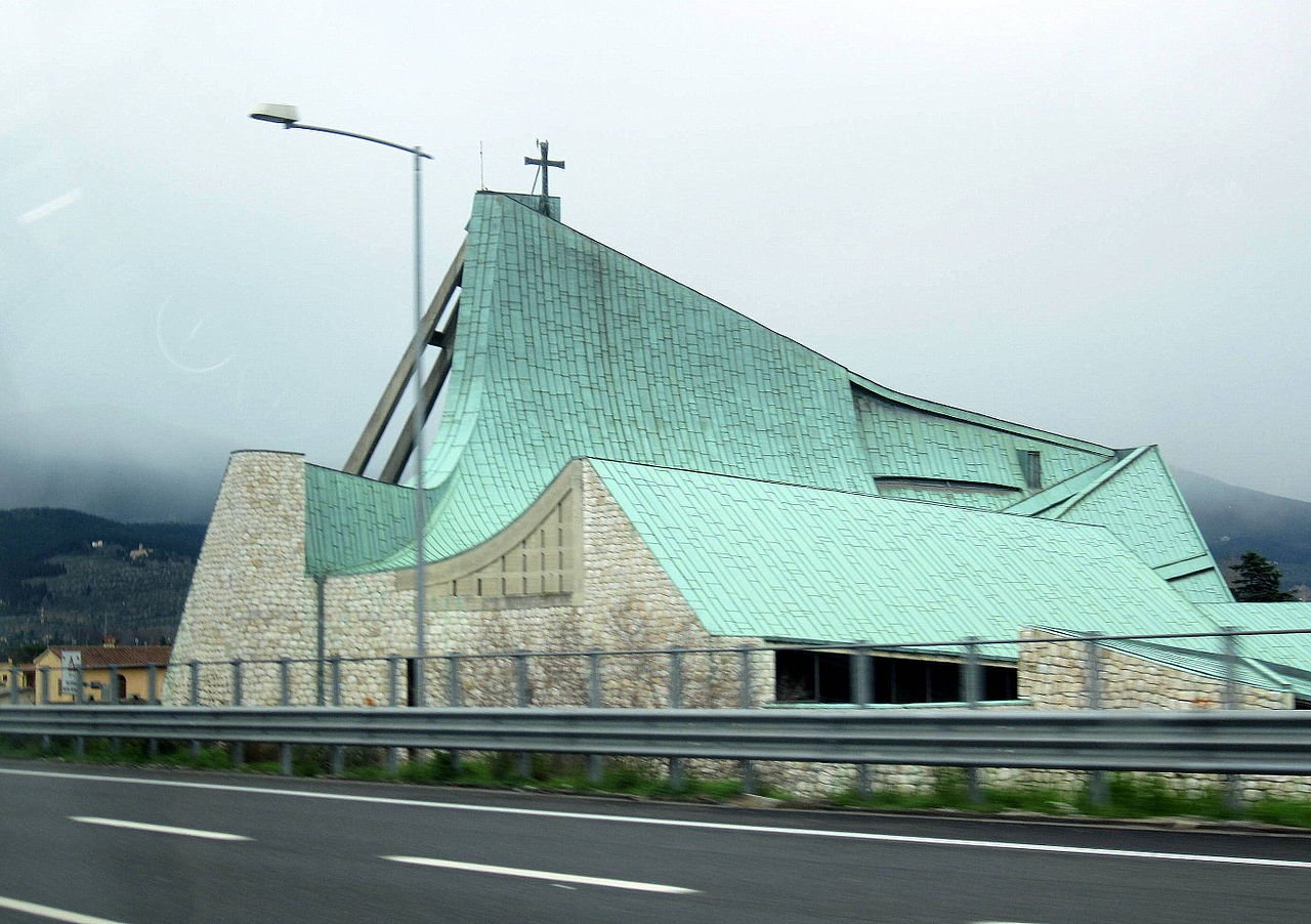 ITALY. Saturday was the fiftieth anniversary of the A1 ‘Autostrada del Sole’, the road that, as of 4 August 1964 cut the travelling time from Milan to Naples from two days to eight hours. Built to mark the A1’s opening (on the Feast of St Francis, patron saint of Italy) was the Chiesa dell’Autostrada – Church of the Motorway – at the Firenze-Nord junction of the A1 and A11 north of Florence, halfway between Milan and Naples. It was designed by Giovanni Michelucci who was also responsible for Florence’s rigorously modernist main SMN railway station, 1934, fashioned from above in the shape of the fascio littorio, (bundle of bound twigs) the Facist symbol. The difference between the two buildings is vast save for their façades of rough-hewn blocks. The Church was considered revolutionary at the time, an ‘organic’ form twisted into various spaces in which different-sized groups of people could meet. It is cited – recognisably so – as a major influence on modern starchitect Frank Gehry.
