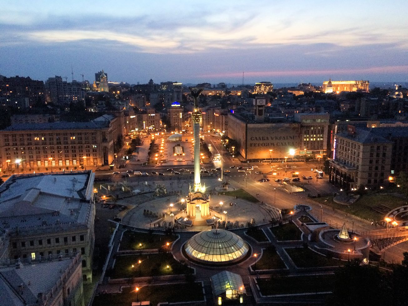 Overlooking Maidan Square in Kyiv (Kiev) from high up in the €45 per night Hotel Ukraine. More photos and map below.