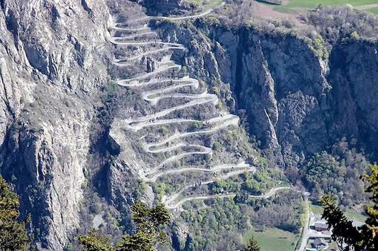 Few drivers seem to tackle the D77b Les Lacets du Montvernier (we can’t blame them it looks absolutely horrific). There’s only one video on YouTube, albeit a good one. Cyclists seem to enjoy it however. It was a feature climb on the Criterium du Dauphine bike race at the weekend and this year, for the first time, it will be included in the Tour de France. Built in 1934, it rises in seventeen hairpins – lacets means hairpins – over 2.5km between the A43 and the tiny village of Montvernier at the top, less than 10km north of Saint Jeanne de Maurienne in the French Alps.