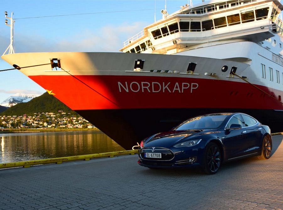 Tesla owners off on Hurtigruten’s Nordkapp cruise ferry. Photo @TeslaMotors