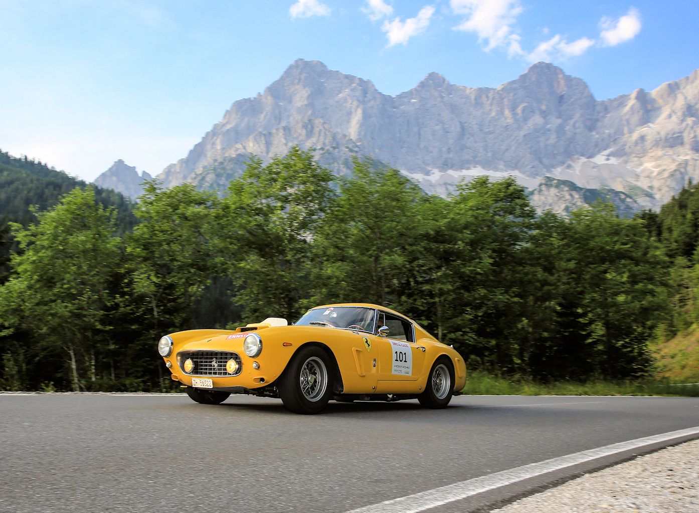 Ennstal Classic 2015, day two: 1961 Ferrari 250 GT Competizione driven by Werner Kummer-Tameling and Gian-Pietro Rossetti from Switzerland along the L711 at Ramsau am Dachstein central Austria against the backdrop of the Dachstein Mountains. Photo © Martin Huber/Ennstal-Classic. See more.