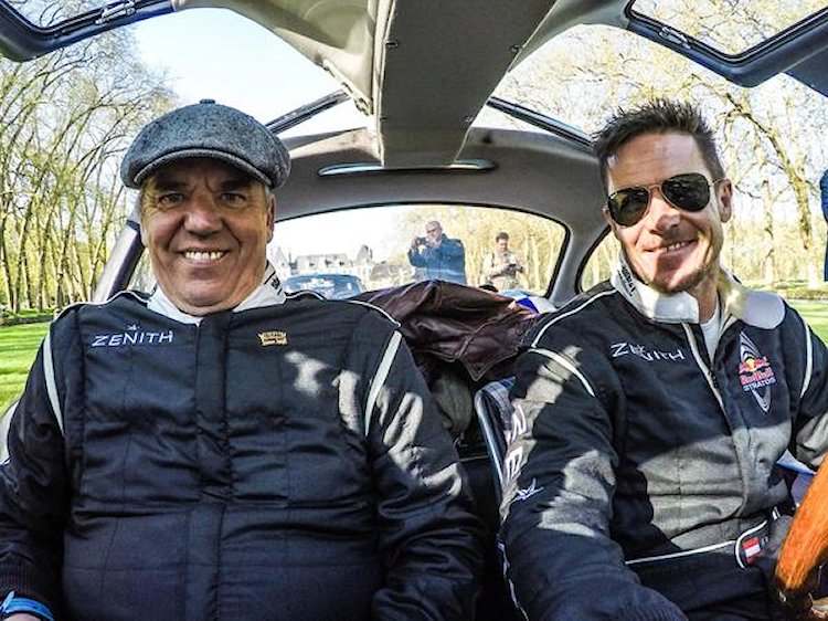 Red Bull daredevil Felix Baumgartner and Auto & Technik Museum boss Hermann Layher relax for a moment on April’s gruelling Paris-Biarritz Tour Auto, in a 1955 Mercedes-Bez 300 SL.