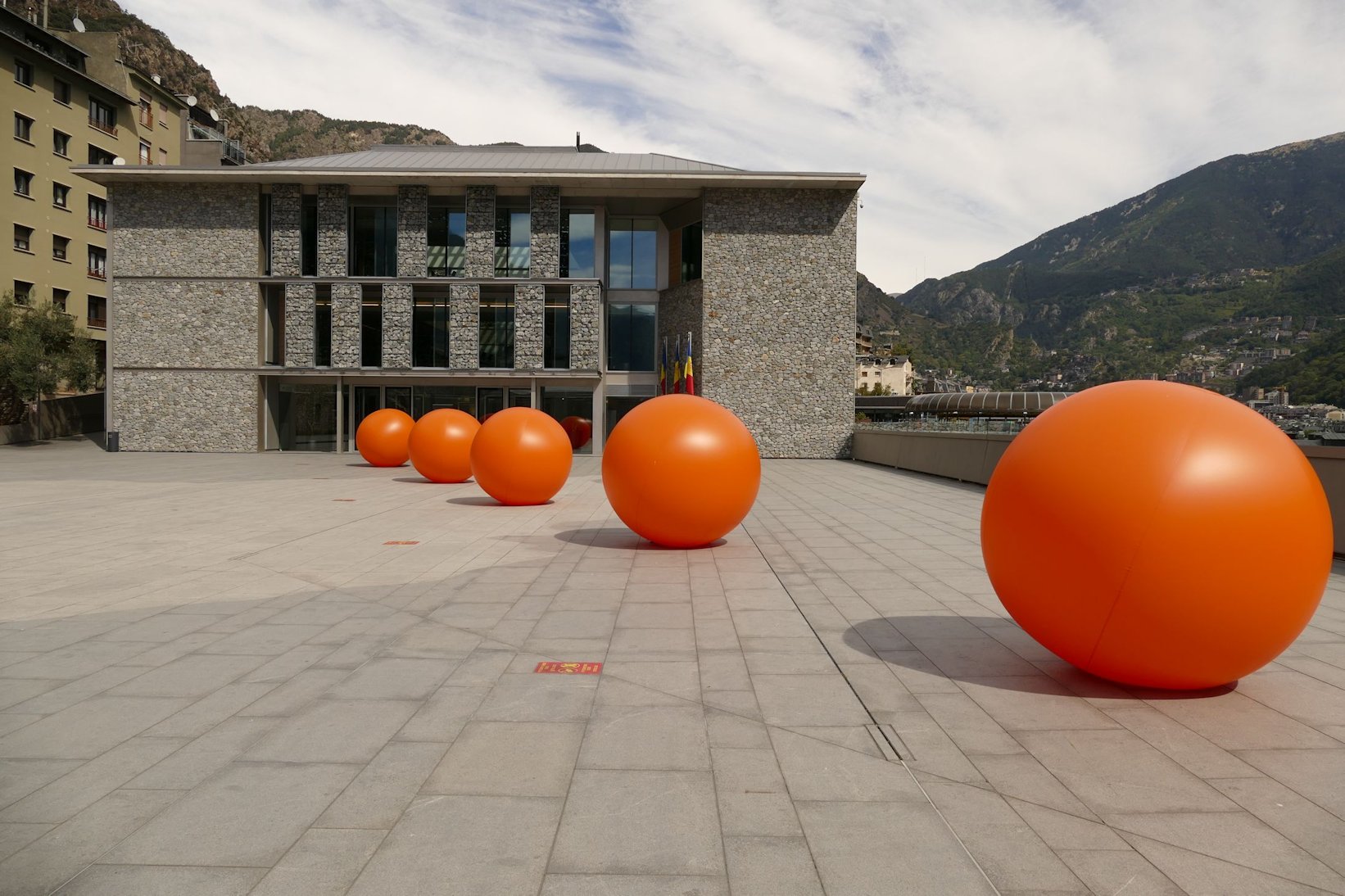 Part of the government building in the old town – solid, discrete, high quality materials with some bright modern touches. A not untypical Andorran scene.